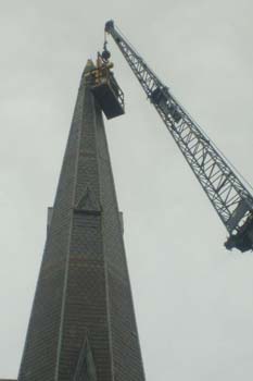 John Bergeron and David Galipeau of J&D Painting and Restoration of North Adams remove the cross from the peak of Notre Dame Church's steeple, some 176 feet above the church parking lot, on Wednesday. The church closed in 2005.