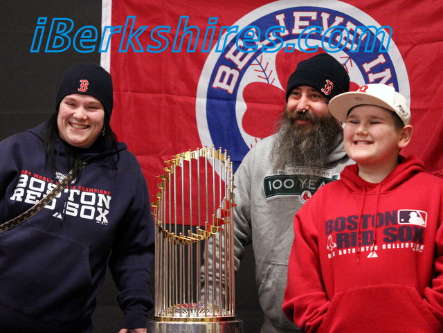Young and old lined up to have their pictures taken with the World Series trophy on Monday at Greylock Bowl & Golf.