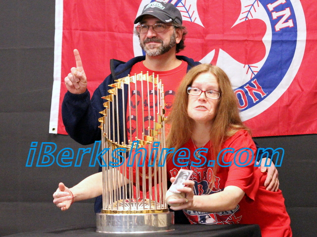 Young and old lined up to have their pictures taken with the World Series trophy on Monday at Greylock Bowl & Golf.