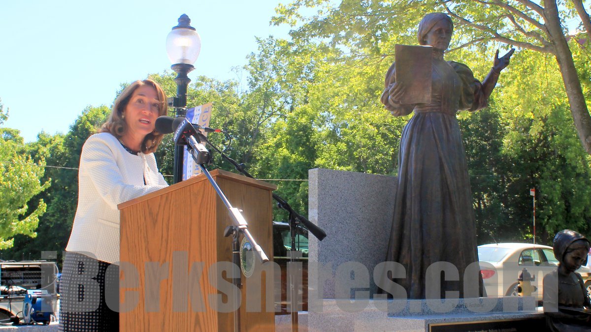 The bronze statue commemorating Susan B. Anthony was unveiled Thursday at the Town Common in Adams with dignitaries including Lt. Gov. Karyn Polito.