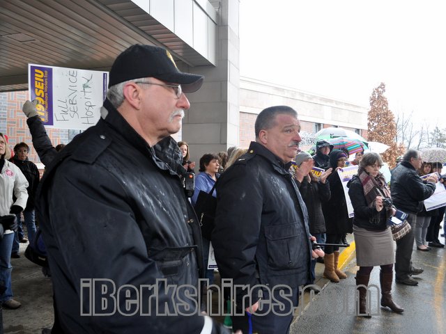 Union members and supporters of North Adams Regional Hospital rallied at the front entrance as the last patients were escorted out. [photos by J. Guerino]