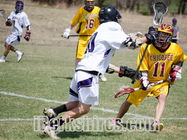 Chicopee's boys lacrosse team scored with less than a minute left in the first overtime period to take a 9-8 win from Pittsfield on Friday afternoon. [photos by Marc J. Wrzesinski]