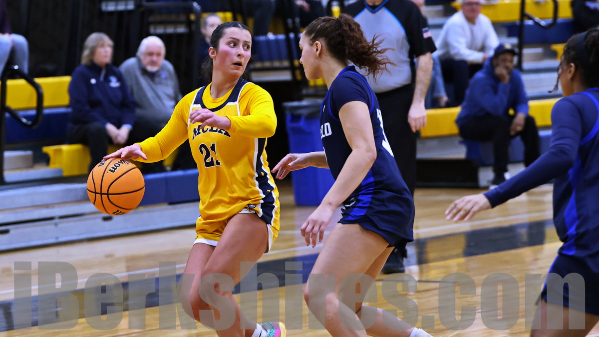 The MCLA Women's Basketball team has 3 players from Berkshire County. #10 Khadija Faye, #21 Abigail Scialabba, #23 Amaya Todd. Westfield State 90 and MCLA 22.