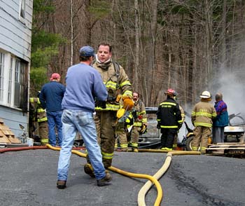 Clarksburg and Stamford, Vt. volunteer firefighters battled an April 17 blaze at 782 West Cross Road in Clarksburg. A garage was destroyed but a nearby house and the grounds were saved. [Photos by Sue Bush]