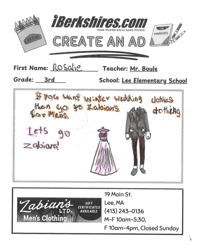 Third-grade students in Brandon Boule's art class at Lee Elementary School showcased a diverse selection of men's apparel at Zabian's Clothing, located at 19 Main St, Lee MA