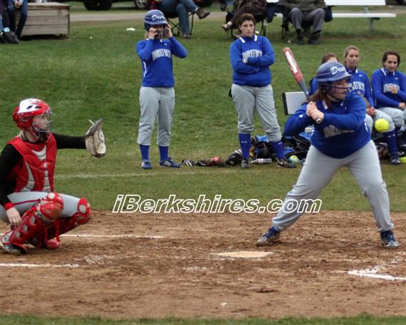 Kendra Hinkell's two-run homer in the top of the sixth inning broke a 1-1 tie and lifted the Drury softball team to a 6-1 win over Mount Greylock on Monday afternoon. (Photos by Chris Piscioneri)