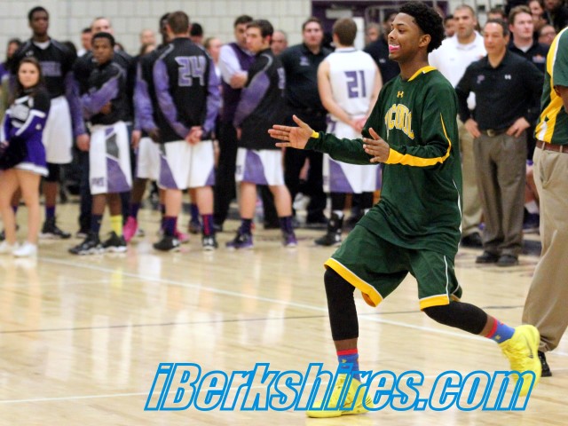 1/31/14 Pittsfield freshman Bryce Daley knocked down a 3-pointer with 11 seconds left on the clock to give the Generals a 71-68 win over Taconic. (Photos by M. Alvarez)