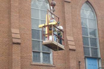 John Bergeron and David Galipeau of J&D Painting and Restoration of North Adams remove the cross from the peak of Notre Dame Church's steeple, some 176 feet above the church parking lot, on Wednesday. The church closed in 2005.