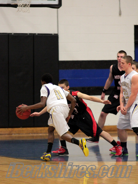 The Mount Greylock boys hold for a 64-53 win over St. Joseph at the Boys and Grirls Club on Friday night. (Photos by K. Brites)