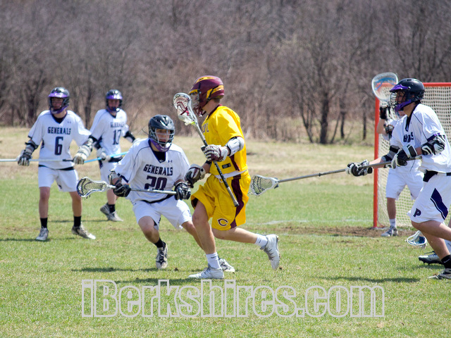Chicopee's boys lacrosse team scored with less than a minute left in the first overtime period to take a 9-8 win from Pittsfield on Friday afternoon. [photos by Marc J. Wrzesinski]