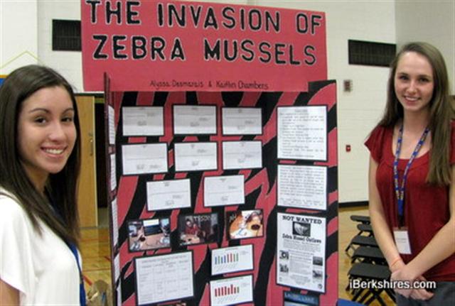 Alyssa Desmarais, left, and Kaitlin Chambers of Westfield High wondered if Otis Reservoir was ripe for a zebra mussel invasion. It is, but the risk is higher at other lakes. |