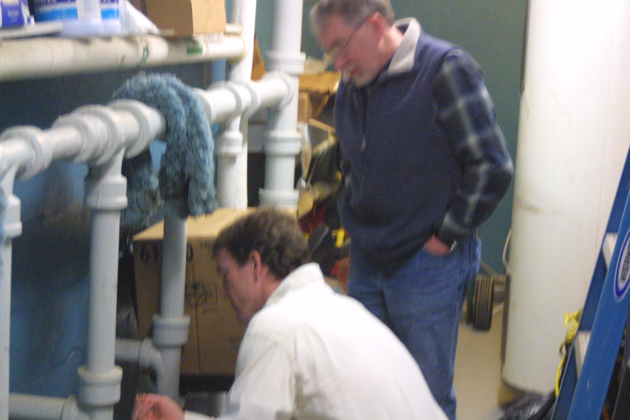 Building subcommittee members inspect cracked pipes that drip sewage into the school's walls.