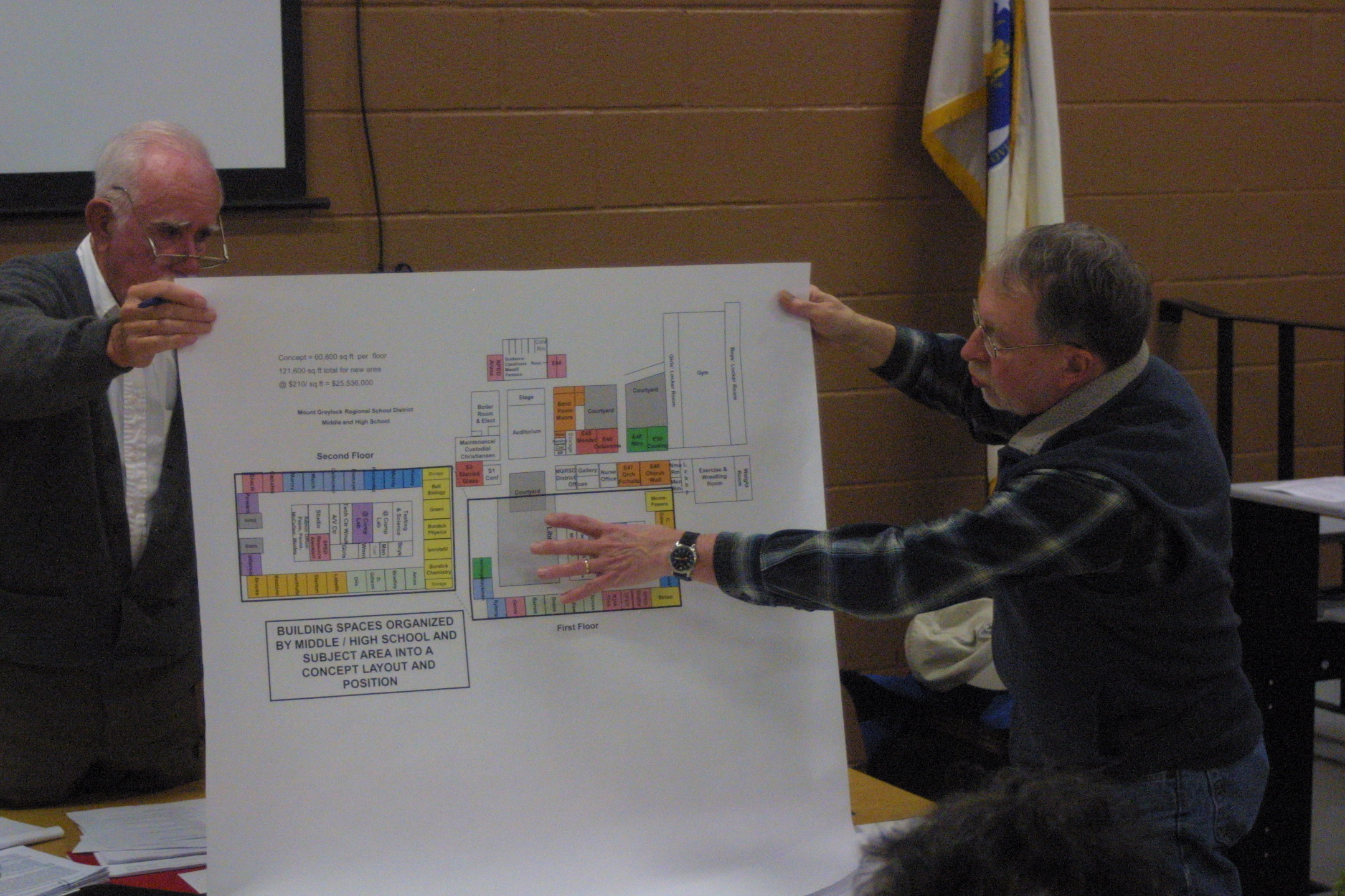 School Committee Chairman Robert Ericson had drawings of such a renovation. The conceptual drawing showed a new two-story building being built in front of the gym, auditorium and boiler rooms.