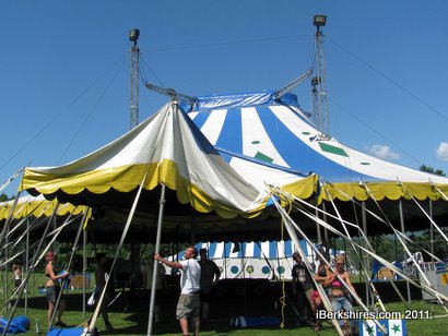 Professionals raise the circus tent for this weekend. The youth performers were to arrive in the area at 5 and be treated to dinner next door at Sweetwood, where they would also give a brief performance for the residents. |
