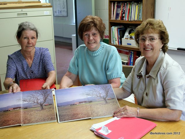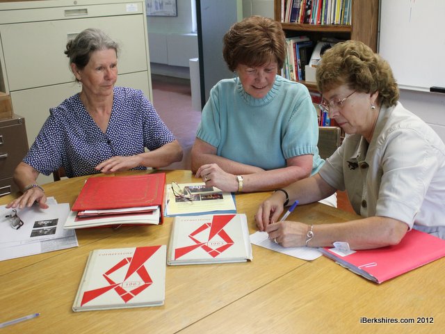 Maureen McGuire, left, Peggy Wyers and Caroline Martel display some of the yearbooks featuring a two-page picture of Mount Greylock from 1962. The classmates are planning a 50th reunion for the school's first graduating class. |