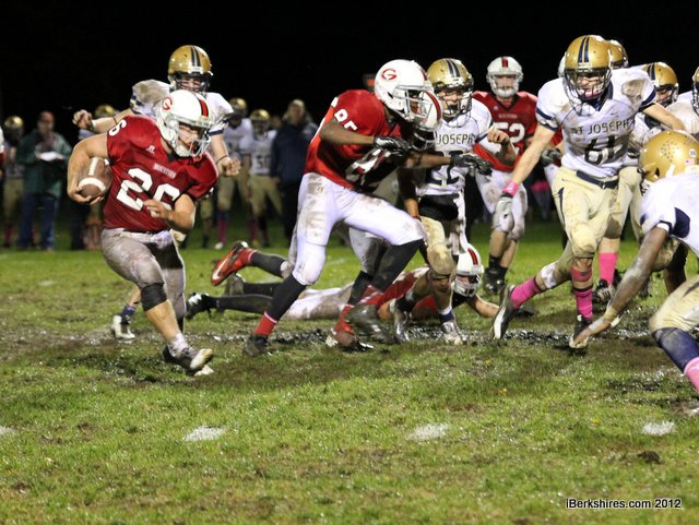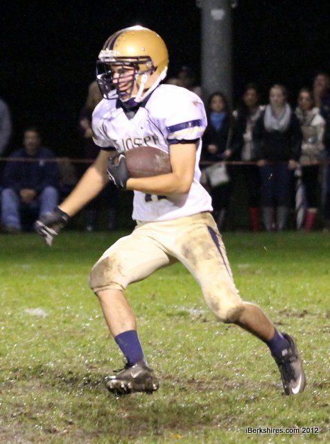 Mount Greylock (7-0, 7-0) senior running back Ethan Ryan always comes to play and Friday night was no different as he outgained the whole Crusader team with 229 yards of rushing to go along with three touchdowns. Late in the second quarter, Ryan busted out a 49-yard touchdown scamper, matching St. Joe's total rushing yards in just one play. The 229 yards put Ryan over the 1,000-yard mark for the season after playing just seven games.