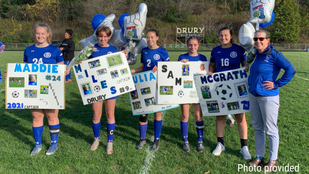 NORTH ADAMS, Mass. -- Madison Saunders and Elli Miles each had a hat trick Tuesday to lead the Drury girls soccer team to a 10-0 win over Taconic on Senior Day for the Blue Devils.