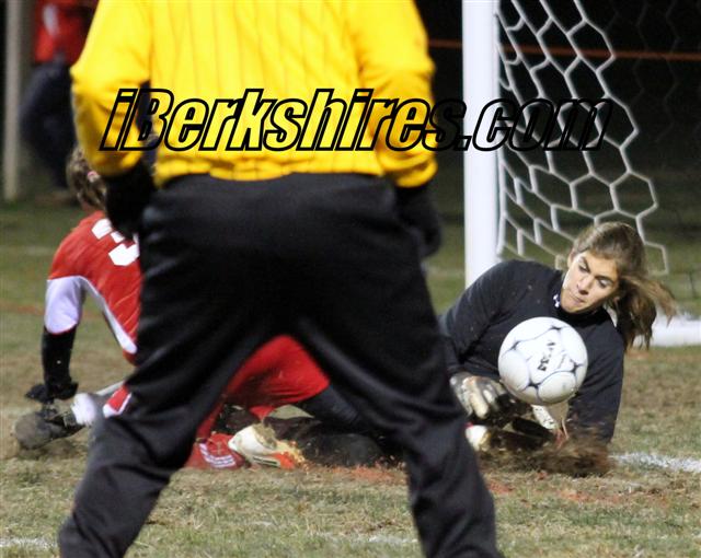 WILLIAMSTOWN, Mass. – Margot Besnard withstood the best shot the Hoosac Valley girls’ soccer team had to offer. The Mount Greylock goalie then beat the Hurricanes with one of her own, drilling her penalty-kick shot into the right corner of the goal to spark the Mounties to a 4-2 shootout win and a 2-1 victory in Tuesday night’s Division 2 Western Mass. quarterfinal.