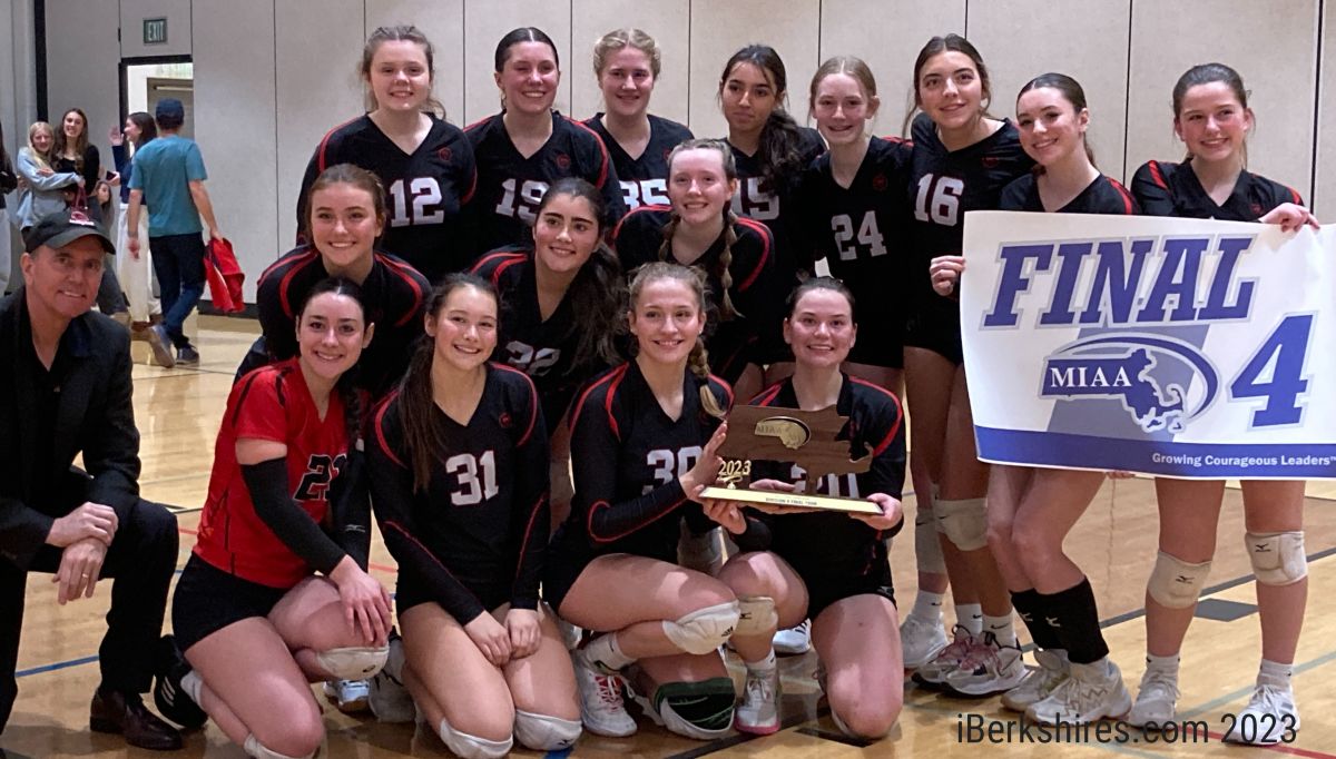 Mount Greylock took the lead early in the second set with a four-point run on the serve of Kelsey MacHaffie (four aces, one kill). It then steadily built its margin, not allowing the Lions to win a point on their serve the rest of the way.