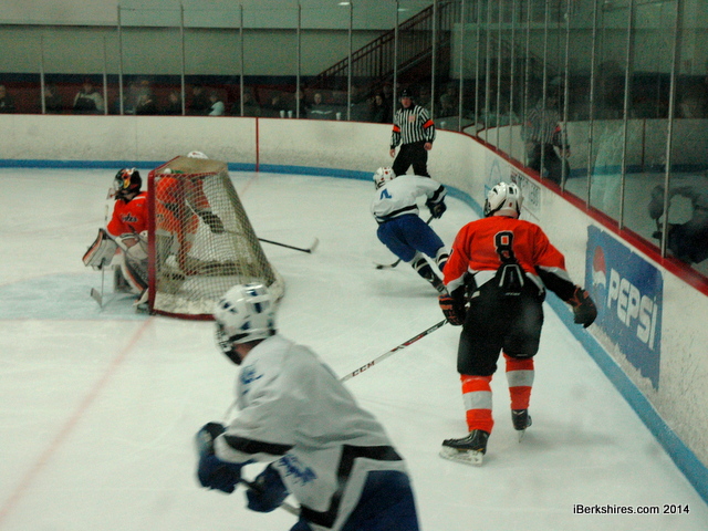 As the period came to a close, many of those on and off the ice thought Belchertown split the lead with less than 10 seconds left. But the bullet that beat Steadman couldn't beat the post and as Belchertown was celebrating a no-goal, the clock ran down.