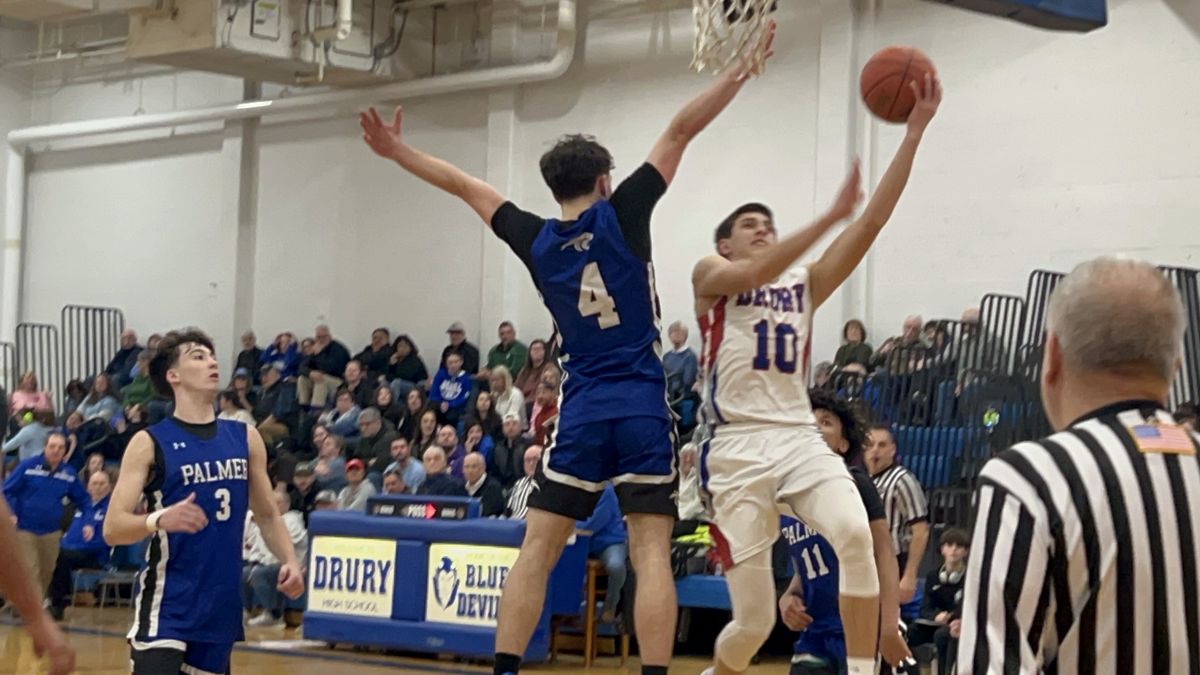 NORTH ADAMS, Mass. – The Drury boys basketball team Saturday executed its defensive gameplan nearly to perfection in a 76-43 win over Palmer that sent the Blue Devils back to the Western Massachusetts Class C title game.