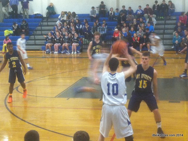 Mount Everett's Kenny Krom (19 points) scored nine of his team's first 11 points and combined with Wilbon (10 points) to register all but two of its first half points, benefiting from ramping the game up to a feverish pace.