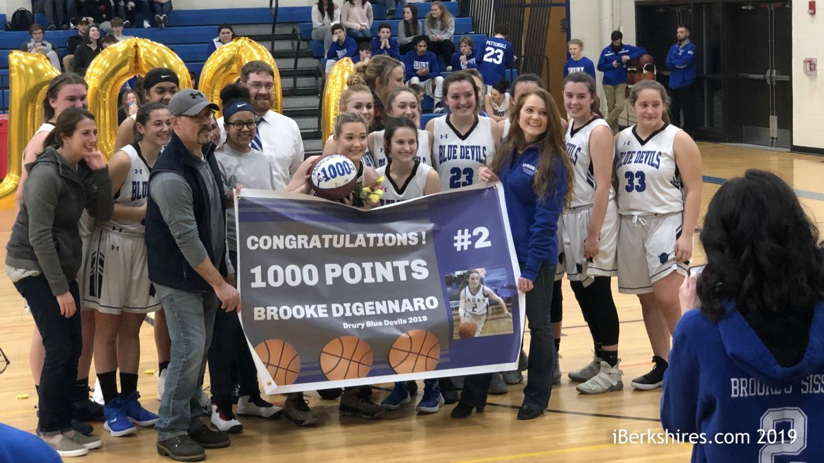 NORTH ADAMS, Mass. — It was an all around great day for the Drury girls basketball taem Friday as it clinched a Western Massachusetts tournament bid on the night Brooke DiGennaro scored the 1000th point of her career in a 62-38 win over Pioneer at home.
