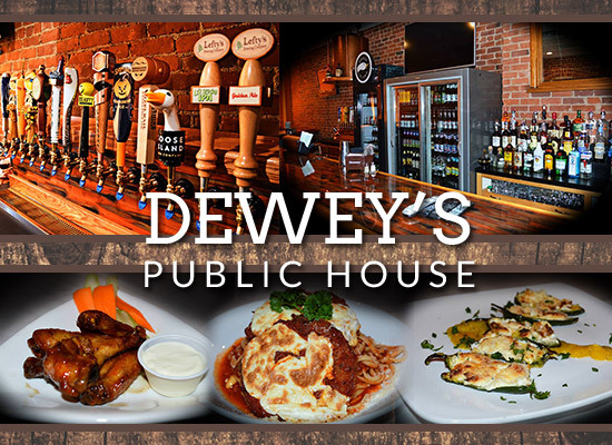 Now Open! Dewey’s Public House is a family friendly restaurant featuring fresh food made to order served in a casual dining atmosphere. Handmade and Hand tossed Pizzas, Homemade Sauces, Full Entrees, Appetizers, Burgers and Wraps, Dewey’s has “Something for Everyone”