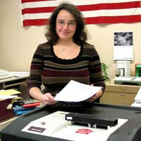 | Lindey Kaiden, a clerk in the Pittsfield registrar of voters office, displays a mock ballot of the type used in new voting machines in the city and Lee and Lenox. (Photo By Anthony Fyden) |