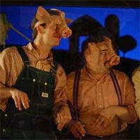Puppetry by Emily DeCola and Eric Wright is the real centerpiece of the production. A variety of different types of puppets was used including hand puppets, rod and stick style, bunraku, and masks. Cows move together on a yoke, a flock of sheep is on a cart and managed by one actor, the narrator is a tiny wheeled rat, and the most expressive of all, the pigs, are actually actors outfitted with rod and stick puppet bodies and mask.