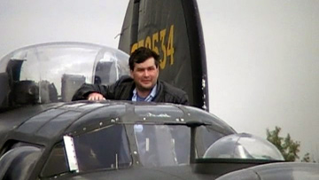 ![]() Bernie Trombley looks out of the B-24 after landing in Pittsfield. At right is a P-51 Mustang. |