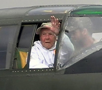 | World War II veteran Joseph Whalen waves from the cockpit of a B-25. |