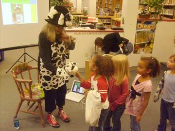 Weis, with a stuffed Holstein on her hat, spotted apron, red sneakers and two "singing" cow puppets told the story not using the book, but with a slideshow mix of family photos and Photoshopped illustrations, breaking the children's book down into bite-size pieces for the young crowd.