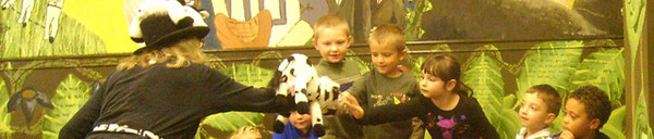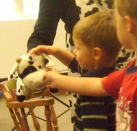 The program ended with a few choruses of "The Cows on the Farm Go ..." led by Weis' hand puppets Susie-Q and Moo-y. Then the reluctant children were herded out (each giving Moo-y a pat goodbye) to make room for the next group.