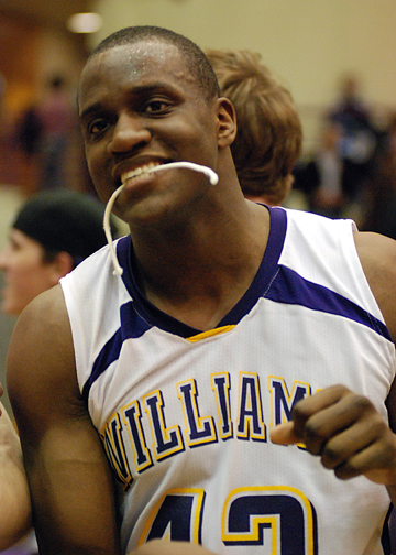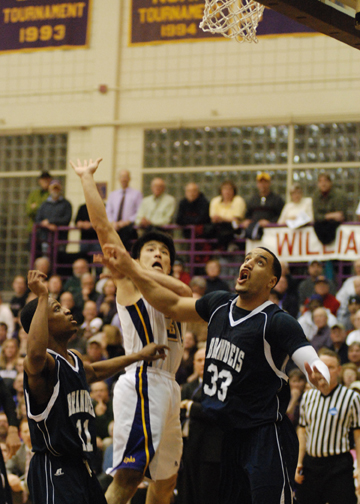 A player gets his bite of the basket after Williams overcame Brandeis in the NCAA semifinals. |