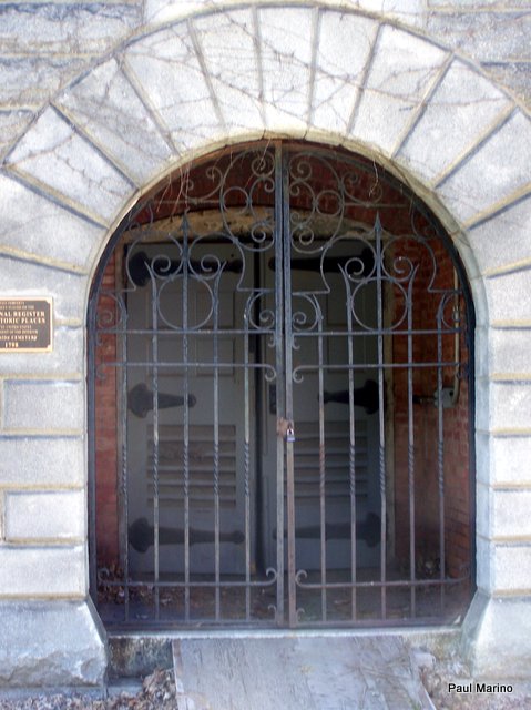 The second receiving vault, built in 1893, is palatial by comparison. Fronting on Brown Street with a circular drive in front of it, the vault was massively built of stone blocks. Its entryway has a Roman arch and is blocked with an ornate pair of iron gates. Five or six feet farther in are the doors. Thick, heavy wooden doors. And beyond the doors? Shelves: nearly a hundred of them, built of wood, each with a flip down hatch and large enough to hold a modern casket. Light and air are admitted through windows at either side, each at the bottom of a shallow air shaft.
