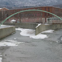 | The flood-control chutes have a commanding presence at the confluence of the north and south branches of the Hoosic, just below the Massahcusetts Museum of Contemporary Art in North Adams. (Photo by Glenn Drohan) |