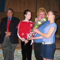 | Bethany Prince, 13, at right, of North Adams, receives a bouquet of flowers from Tiffany Young, 11, and her mother, Susan, as Mayor John Barrett III enjoys the moment during the Northern Berkshire Community Coalition awards ceremony Monday. |