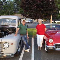 | Ron and Ellie Jones pose with their two toys at the Piston Poppers' Tuesday night Car Cruise in Lenox. (Photo by Deborah Rawson) |