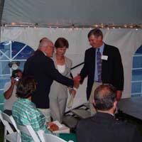 | Dr. E. Wayne Wilkins, left, receives congratulations from Jim Hunter, as Hunter’s wife, Joan, looks on. (Photo by Paul Hopkins) |