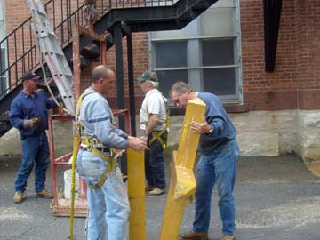 Steeplejacks David Galipeau and John Bergeron, owners of J&D Painting and Restoration of North Adams, disassembled the nearly nine-foot cross into two sections to bring it down. It was the third one they had removed this year after Our Lady of Incarnation Church and the Notre Dame School, which had the cross removed from the cupola on its roof several weeks ago.