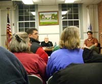 | Michael Milazzo, left, responds to a neighbor at the Clarksburg Town Hall. |