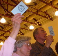Attempts at voice votes on both articles were discarded and the audience resorted to holding up blue tickets they received on registering at the meeting to show their positions. A motion to use Australian, or secret, ballot for the wetlands bylaw was defeated by voice vote.