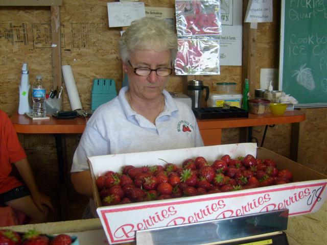 Joanne Barcomb weighs berries at Mountain View Farm.