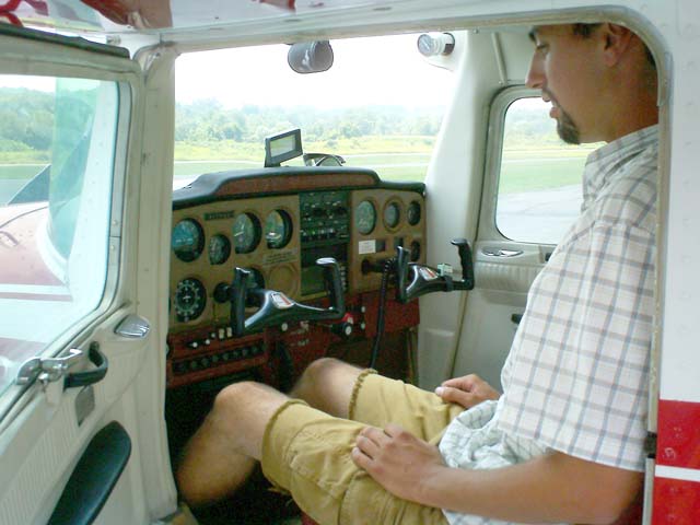 Matthew Champney shows off the controls of Shamrock Aviation's Cessna flight trainer. |