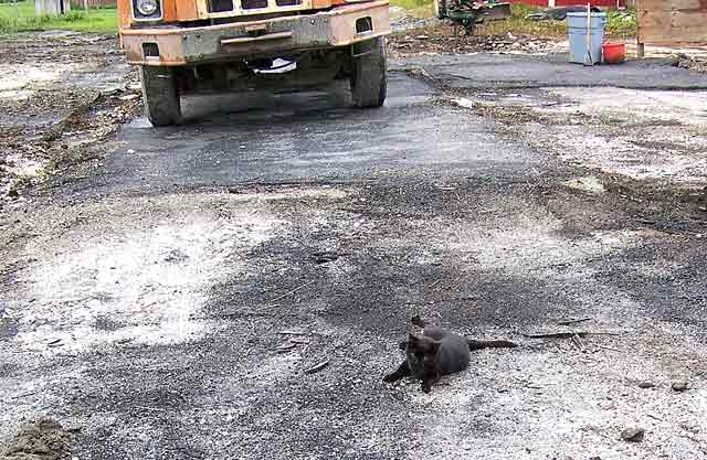 A black cat lays on the ashen ground where the hay barn stood.
