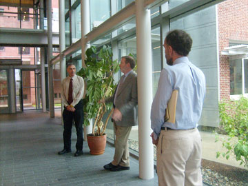 David Pilachowski, left, Michael Brown and James Kolesar in the spacious South Academic Building's main hallway. |
