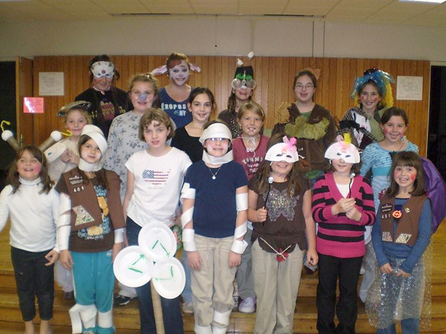 As part of their ecology-related badge requirements, the girls made unique costumes from a variety of recyclable materials. The collection of original costumes included mummies, a butterfly, "Recycle Girl," fairies, a mosquito, a cow, and many more clever creations.