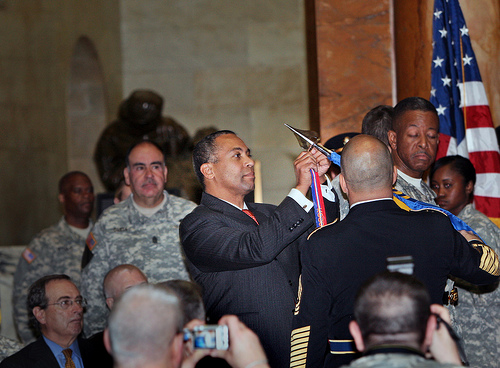 Gov. Deval Patrick awards campaign streamers Friday to Guard units for their duties in Afghanistan, Iraq and Kosovo at a ceremony in Nurses Hall at the State House |