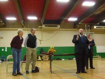 "They are the reason why we're all here," said league official James Cunningham. "Without them, there wouldn't have been basketball for girls. Instead, I would have had to go to dancing recitals and skating demonstrations. Thank God for you guys," he continued, to laughter.Choking back tears, Margaret Whitney thanked everyone for recognizing the work her husband had done. "Because he does not want the recognition, he never wanted to be out in the limelight ... but I can't tell you how much it means to me to have him thanked in this way.
